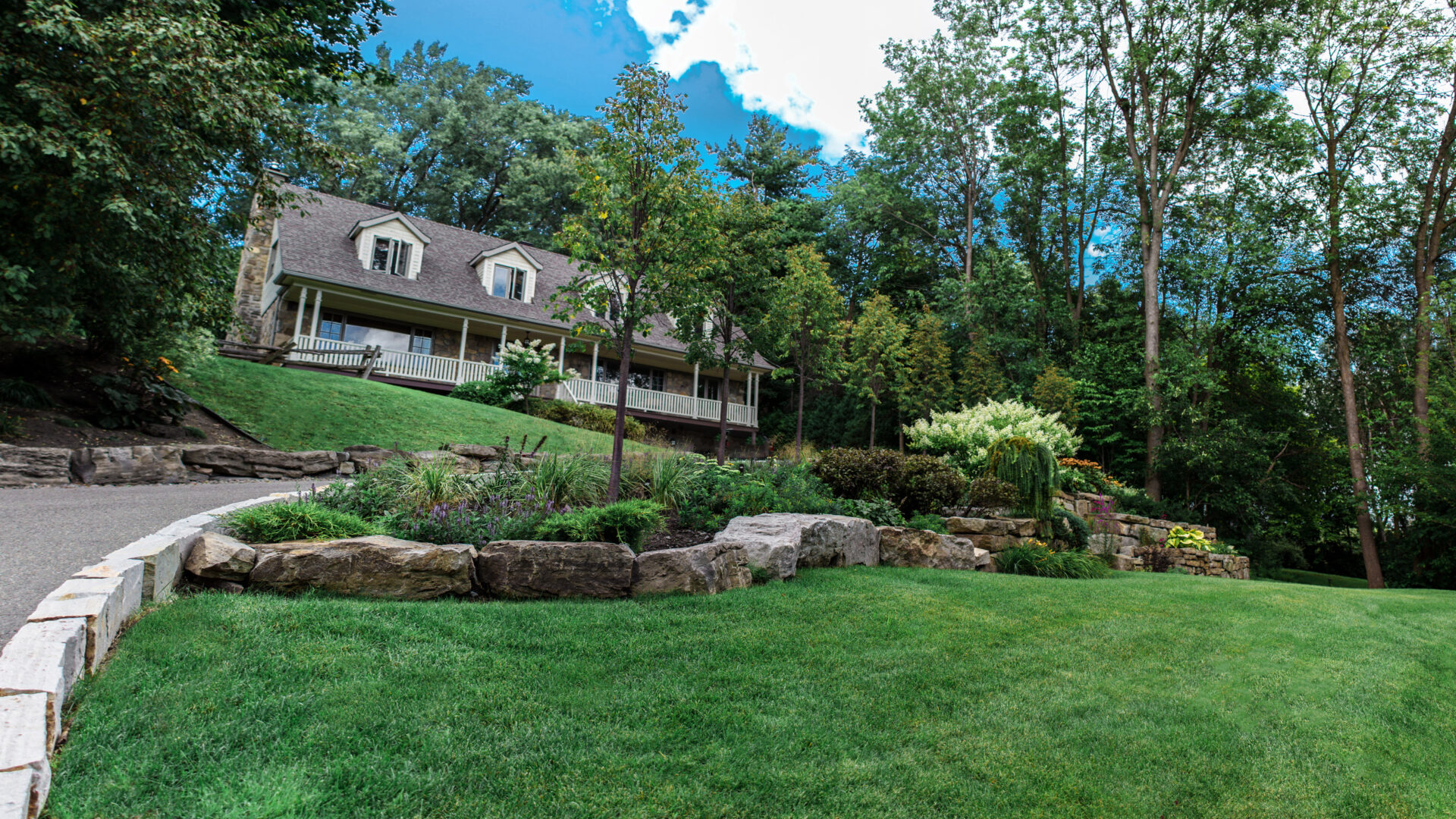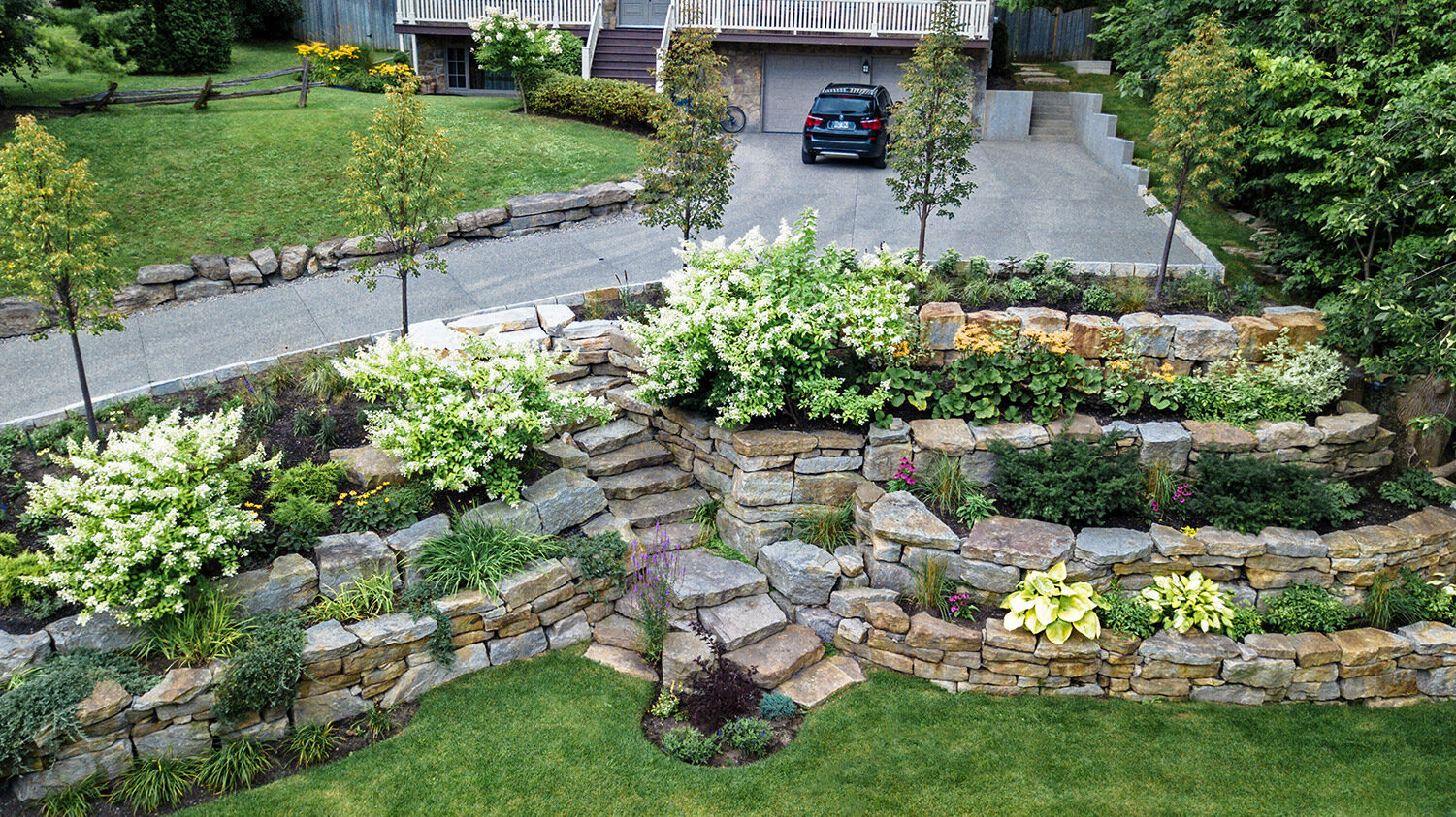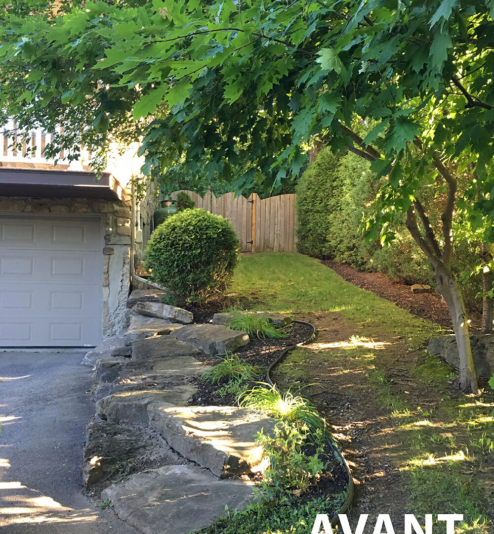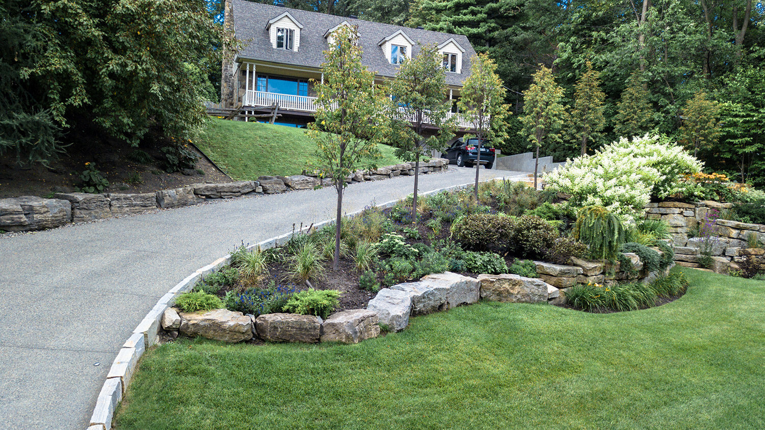 Une fois l’entrée de garage complétée, nous nous sommes tournés vers l’aménagement du paysage avoisinant. Avant l’installation de l’entrée de garage, la fosse septique a été déplacée en avant, forçant les murs en grosses roches d’être enlevés et la tuyauterie installée. Une opération qui a laissé la devanture en piteux état. En plus de reconstruire une partie des jardins en paliers, notre objectif était d’ajouter un peu d’intimité. Sept tilleuls ont été plantés le long de l’entrée de garage pour créer un écran naturel et aussi établir une délimitation visuelle de la bordure pour les conducteurs. Un érable mature de 8 mètres a été planté en avant pour cacher un poteau des services publics. Une platebande a été réalisée sous les nouveaux tilleuls et garnie de vivaces et d’herbes pour créer un jardin naturel et attrayant durant toute la saison estivale.