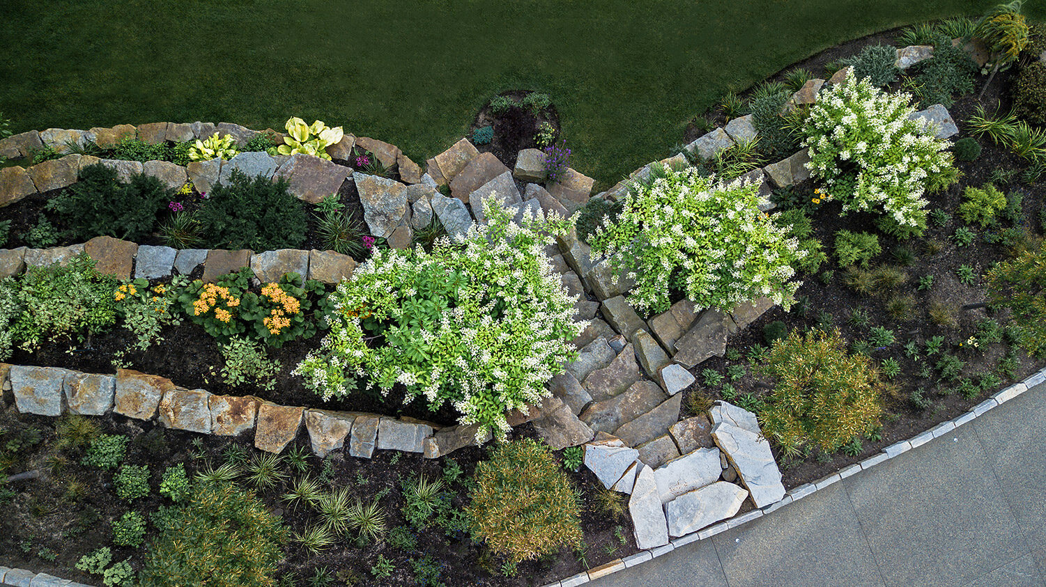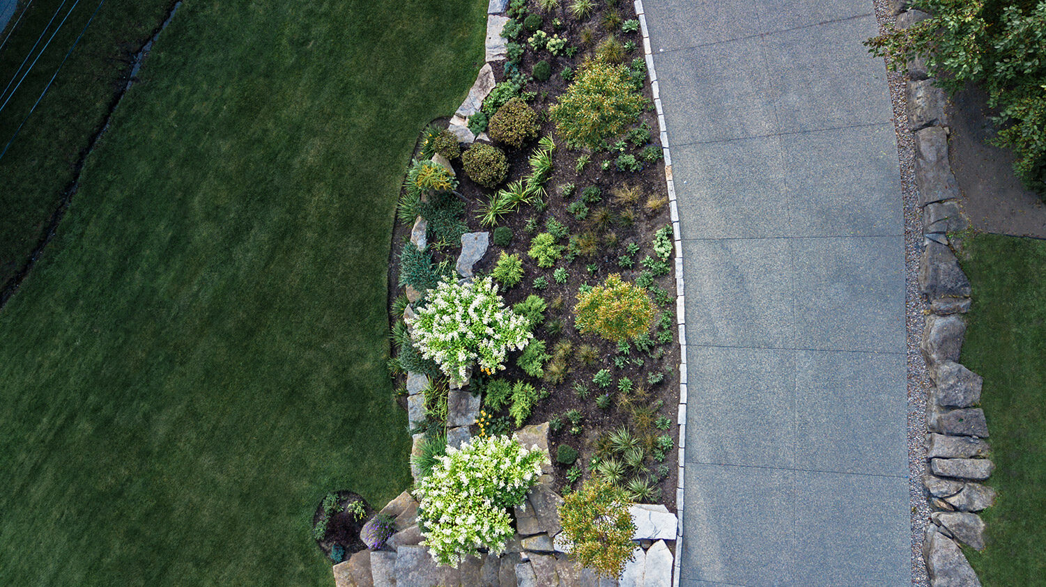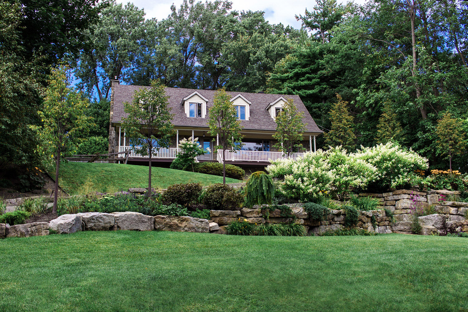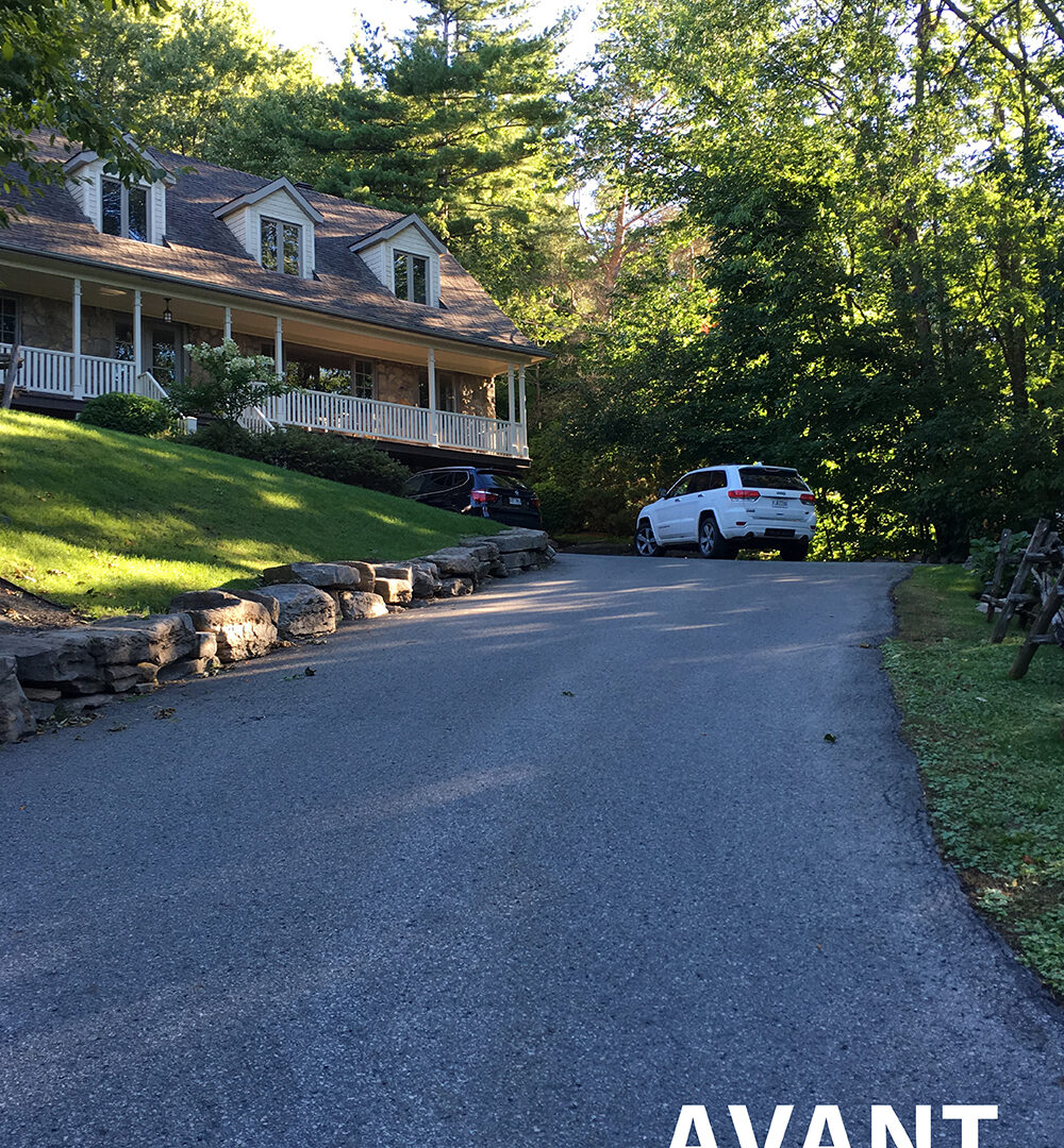 Une fois l’entrée de garage complétée, nous nous sommes tournés vers l’aménagement du paysage avoisinant. Avant l’installation de l’entrée de garage, la fosse septique a été déplacée en avant, forçant les murs en grosses roches d’être enlevés et la tuyauterie installée. Une opération qui a laissé la devanture en piteux état. En plus de reconstruire une partie des jardins en paliers, notre objectif était d’ajouter un peu d’intimité. Sept tilleuls ont été plantés le long de l’entrée de garage pour créer un écran naturel et aussi établir une délimitation visuelle de la bordure pour les conducteurs. Un érable mature de 8 mètres a été planté en avant pour cacher un poteau des services publics. Une platebande a été réalisée sous les nouveaux tilleuls et garnie de vivaces et d’herbes pour créer un jardin naturel et attrayant durant toute la saison estivale.