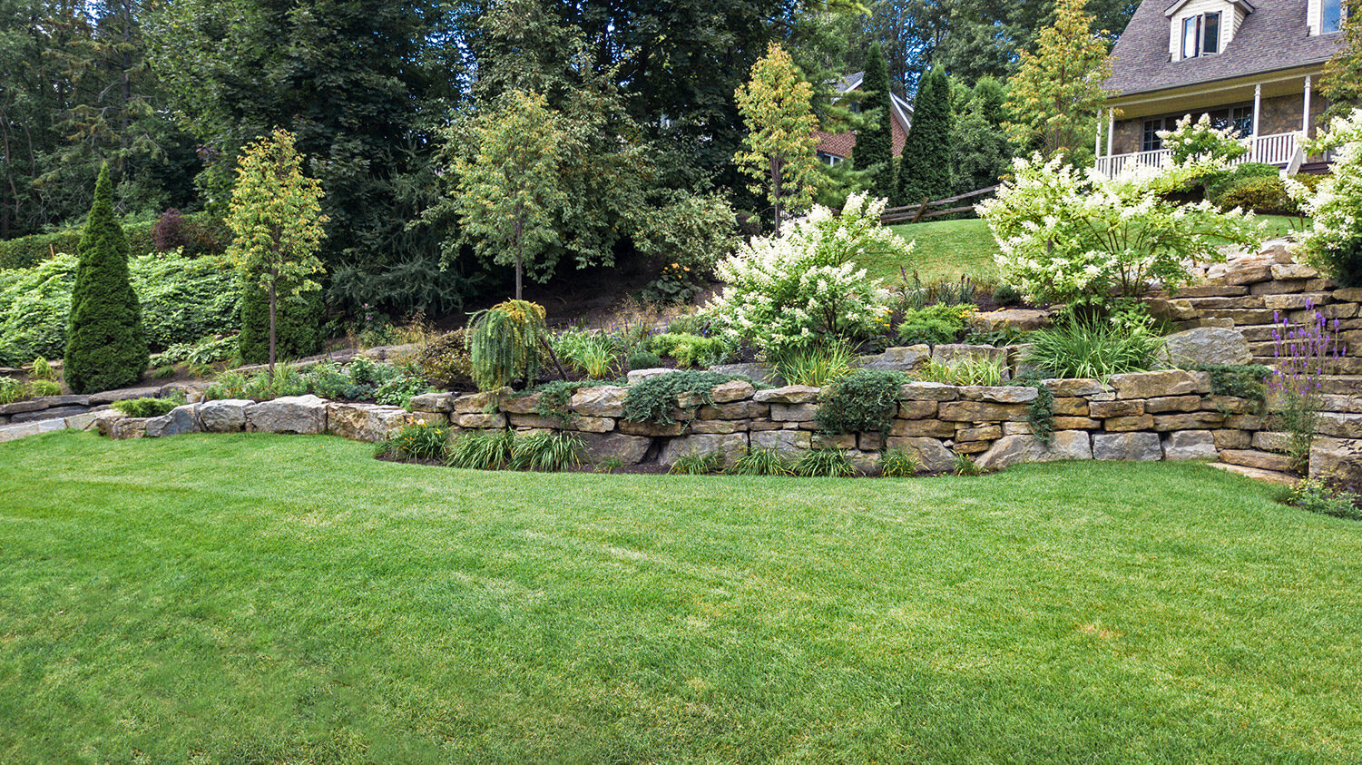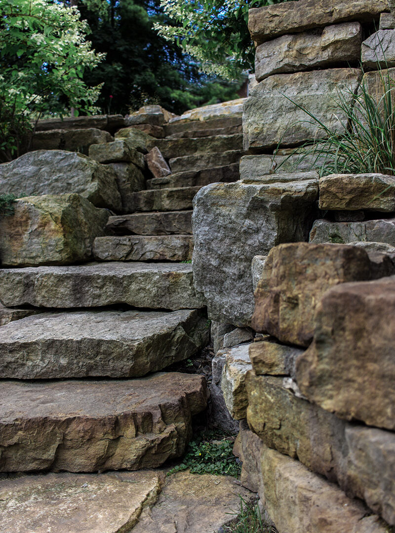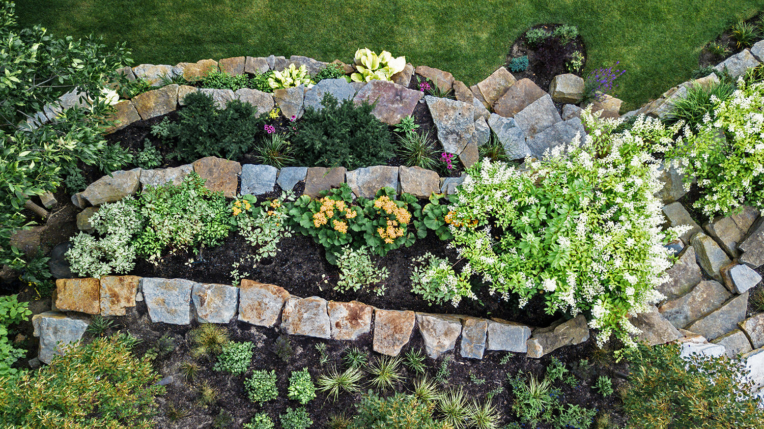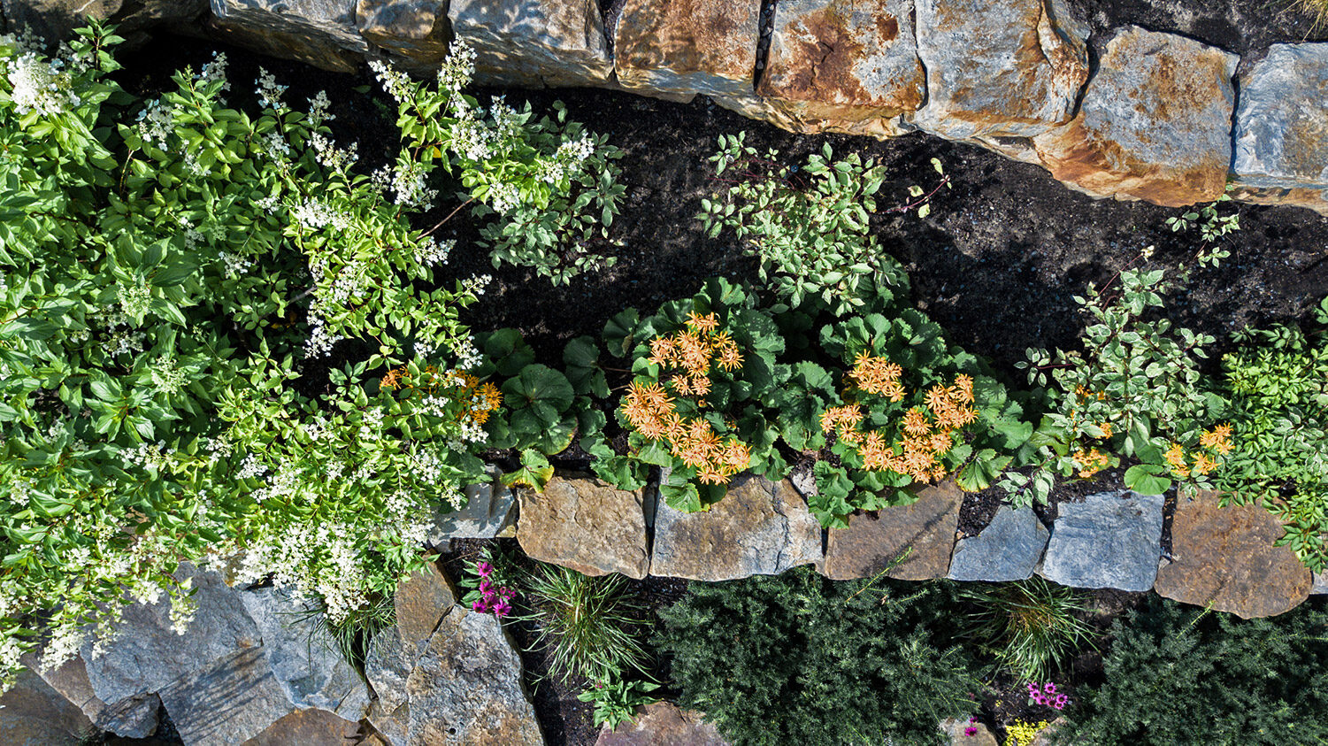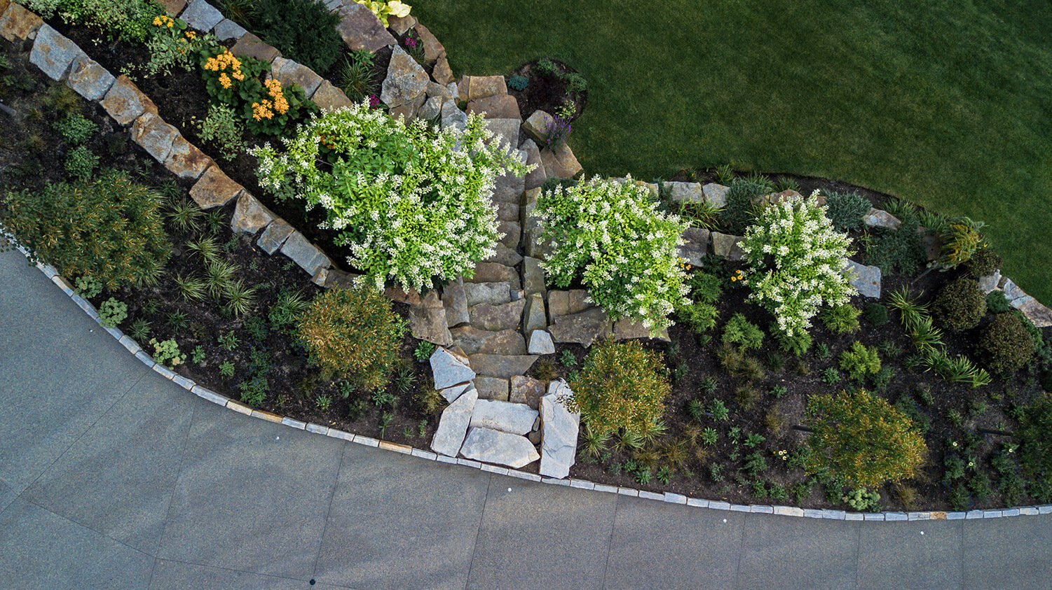 Une fois l’entrée de garage complétée, nous nous sommes tournés vers l’aménagement du paysage avoisinant. Avant l’installation de l’entrée de garage, la fosse septique a été déplacée en avant, forçant les murs en grosses roches d’être enlevés et la tuyauterie installée. Une opération qui a laissé la devanture en piteux état. En plus de reconstruire une partie des jardins en paliers, notre objectif était d’ajouter un peu d’intimité. Sept tilleuls ont été plantés le long de l’entrée de garage pour créer un écran naturel et aussi établir une délimitation visuelle de la bordure pour les conducteurs. Un érable mature de 8 mètres a été planté en avant pour cacher un poteau des services publics. Une platebande a été réalisée sous les nouveaux tilleuls et garnie de vivaces et d’herbes pour créer un jardin naturel et attrayant durant toute la saison estivale.