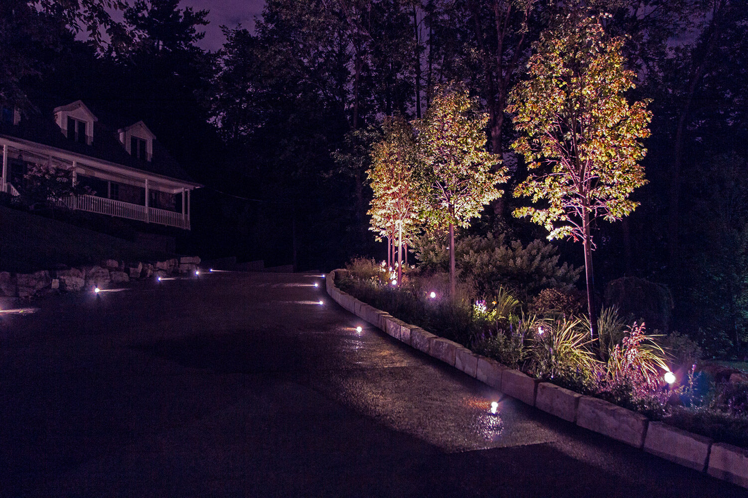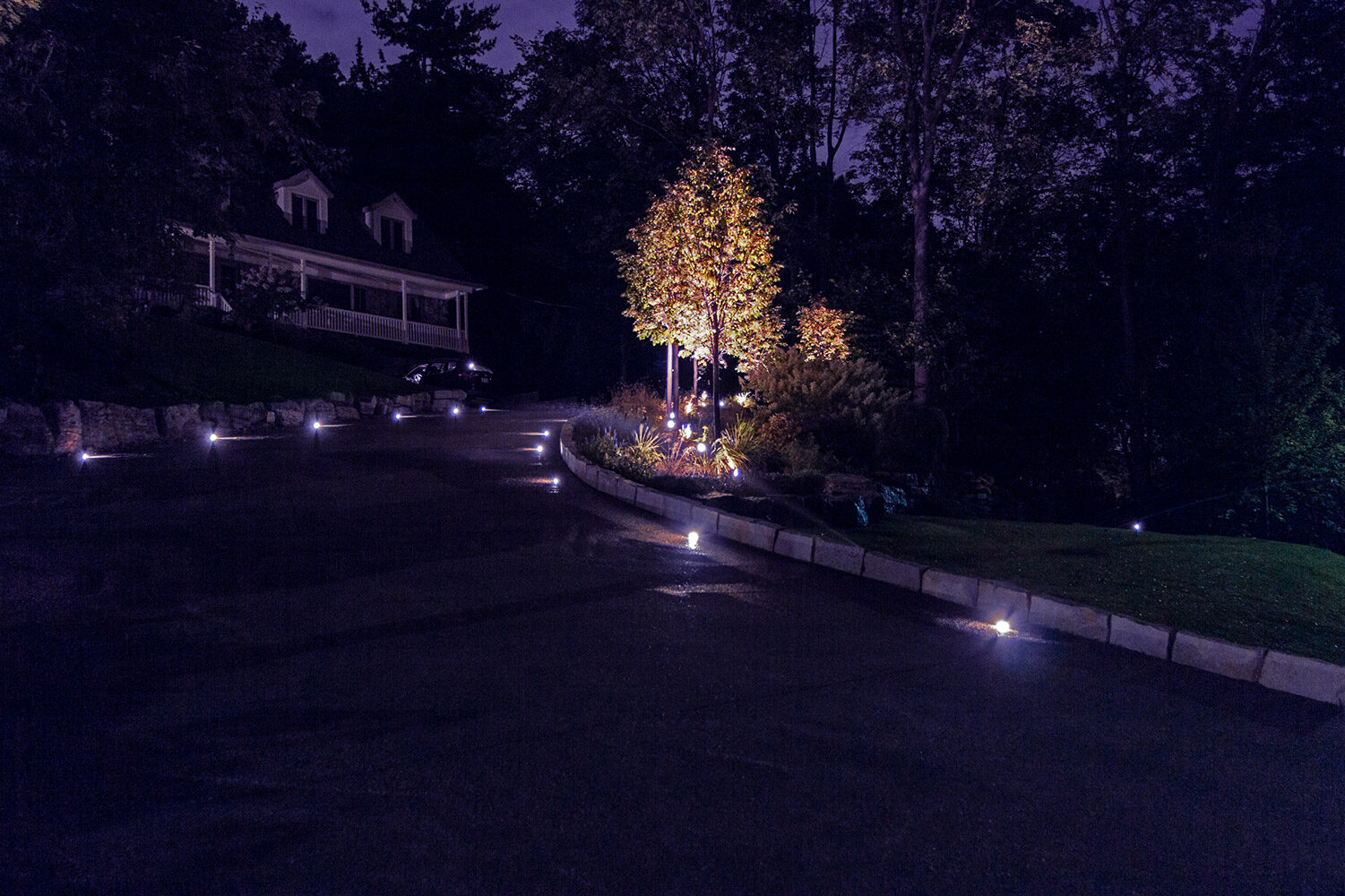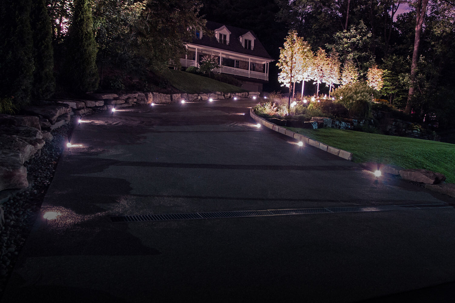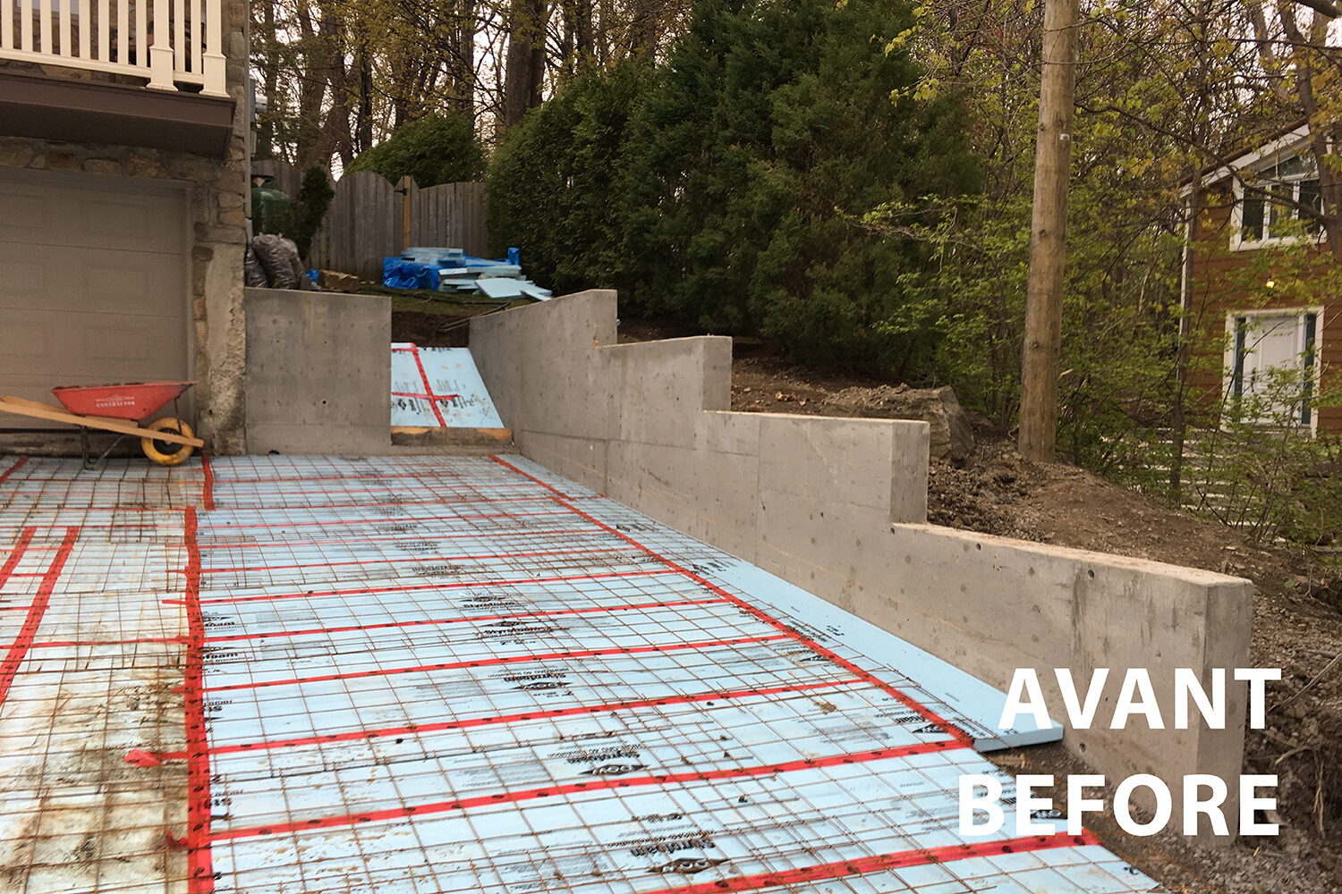 Une fois au plan final, le propriétaire était encore préoccupé par la pente durant les mois d’hiver. La solution a été d’installer un système de fonte de neige par rayonnement sous toute l’entrée de garage. Un éclairage discret, mais efficace, a aussi été incorporé dans le revêtement pour éclairer les bords.