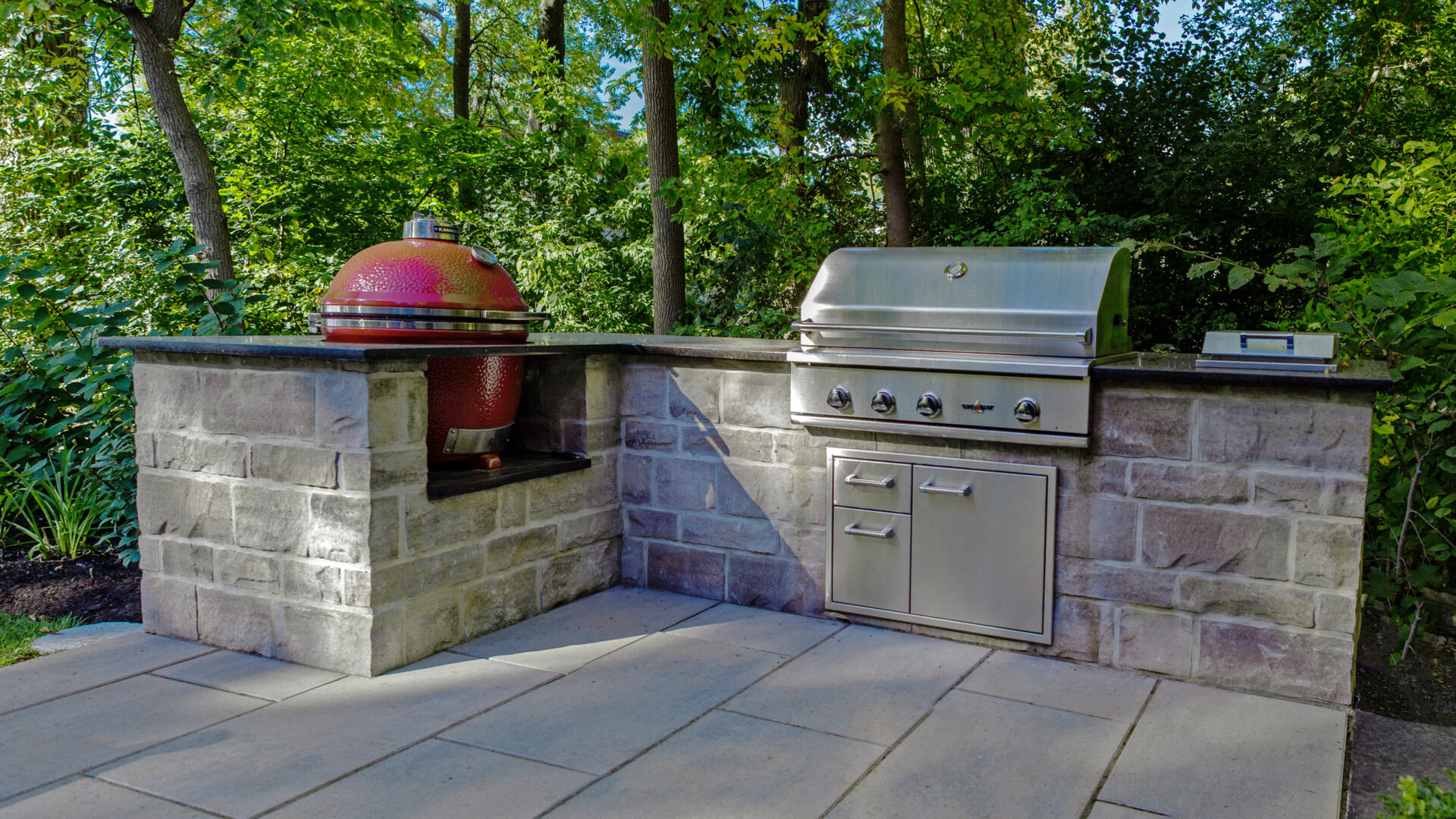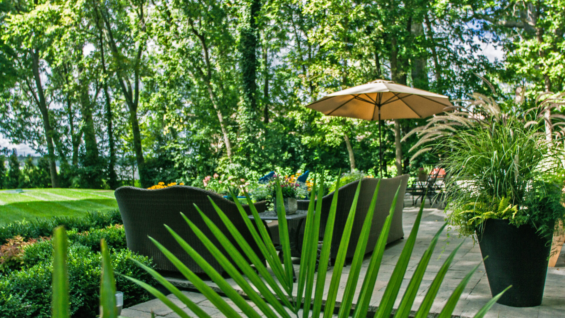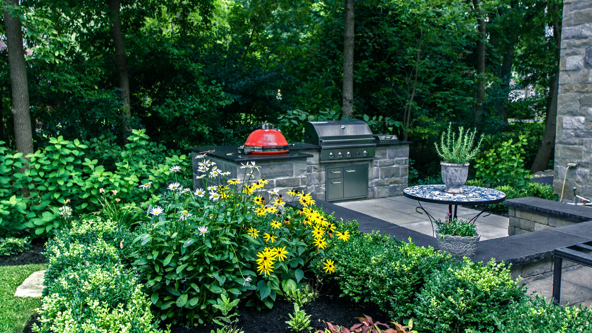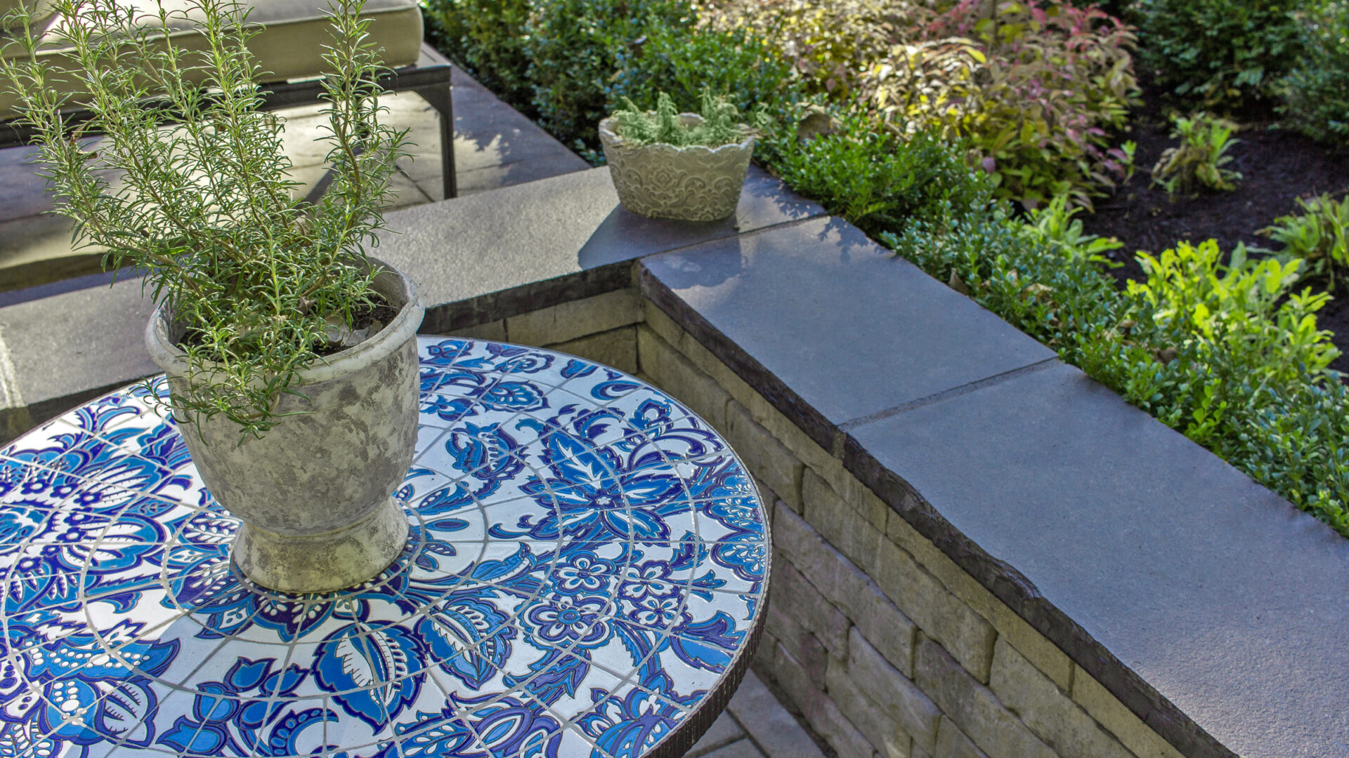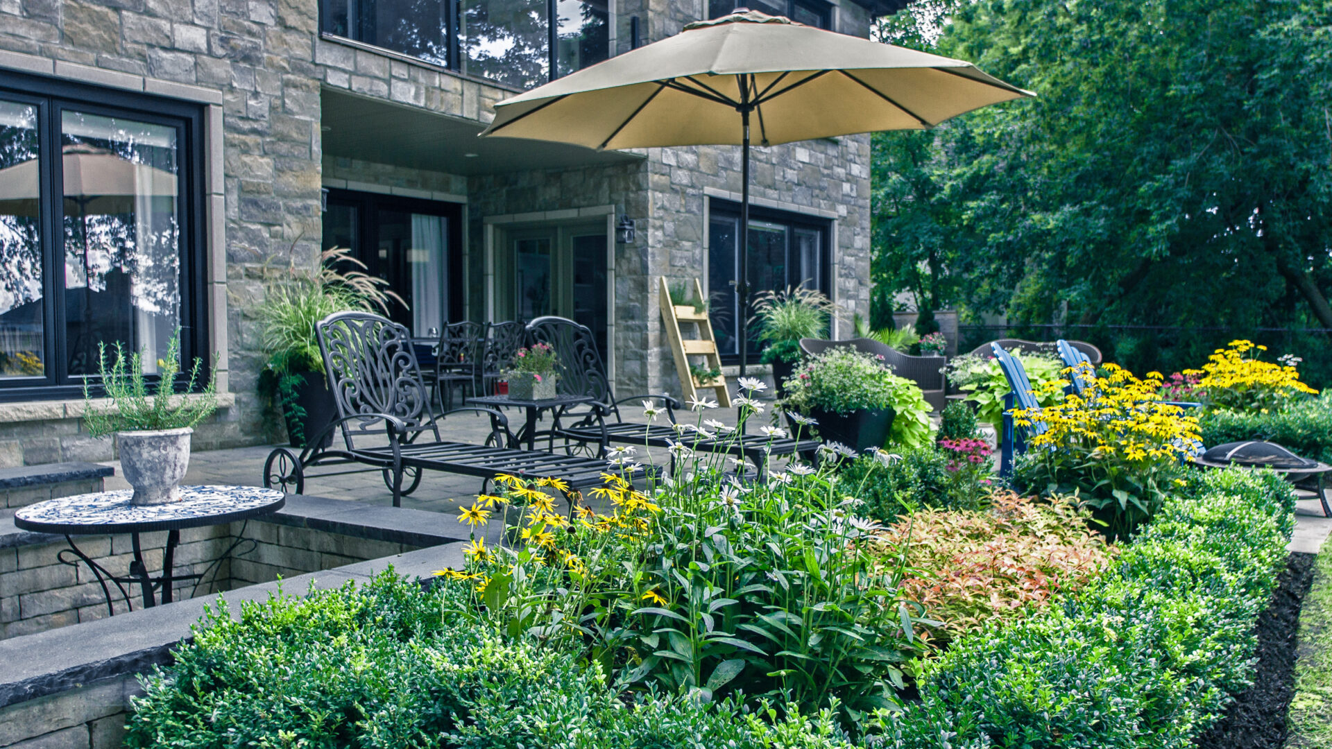 Les matériaux utilisés étaient variés et incluaient la pierre naturelle, des blocs prémoulés pour les murs, du pavé uni et de grandes quantités de plantes et de terre.